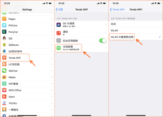 2.若是iphone手机,查看手机上Tenda WiFi APP是否有设置WiFi权限,步骤如下:打开手机的“设置”找到并点击“Tenda WiFi”APP“无线数据”—勾选“WLAN与蜂窝移动网”;