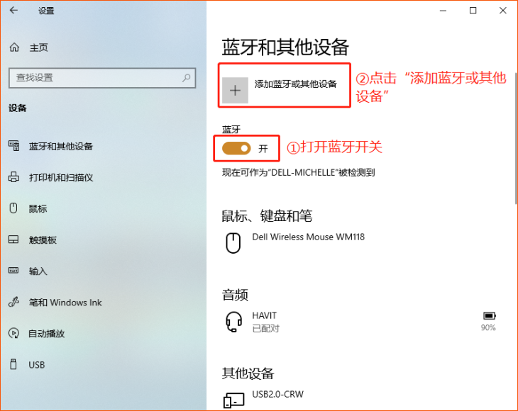 1、打开手机和电脑的蓝牙,然后在电脑的蓝牙设置菜单选择“添加蓝牙或其他设备”。