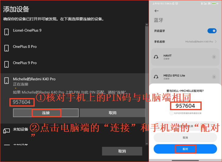 3、稍等一会,电脑端所选的蓝牙设备下会出现一个PIN码,先核对和手机弹出来的是否相同,若相同,点击电脑端的“连接”和手机端的“配对”。