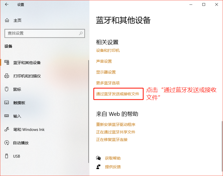 1、电脑上蓝牙和其他设备的菜单中,点击“通过蓝牙发送或接收文件”。