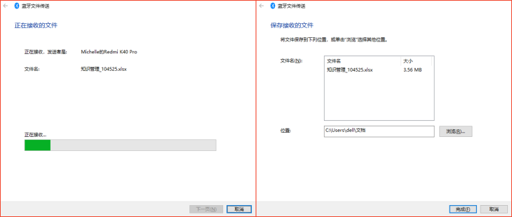 4、电脑端会自动接收文件,文件接收完毕后,点击“下一步”,会让设置文件保存位置,点击“完成”。