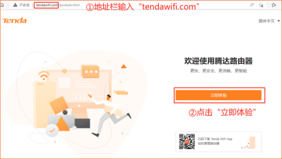 1、 打开浏览器,在地址栏中输入“tendawifi.com”或者“192.168.0.1”,点击回车键(Entet键),进入路由器设置页面(出厂状态无登录密码),点击“立即体验”。