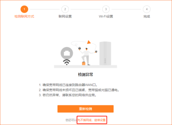 2、 系统会检测到WAN口未插网线(中继模式WAN口无需插网线),点击“先不插网线,继续设置”。