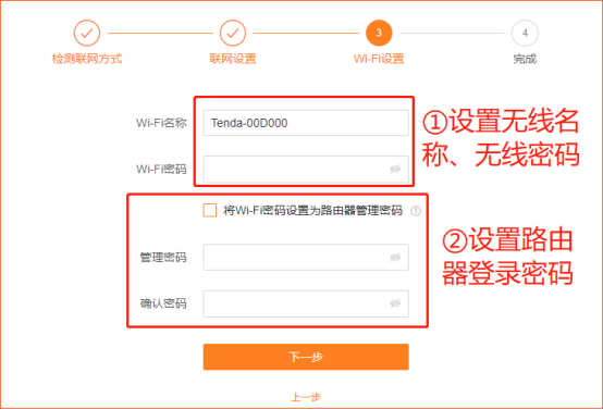 3、 设置路由器的无线名称、无线密码、登录密码,点击“下一步”。(若要设置登录密码与无线密码一致,勾选“将WiFi密码设置为路由器管理密码”)