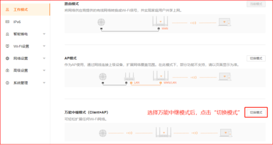6、 选择“万能中继模式”,并点击“切换模式”。