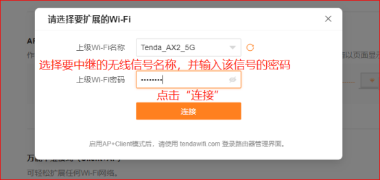 7、 选择要中继的无线信号,并输入该信号的WiFi密码,点击“连接”。