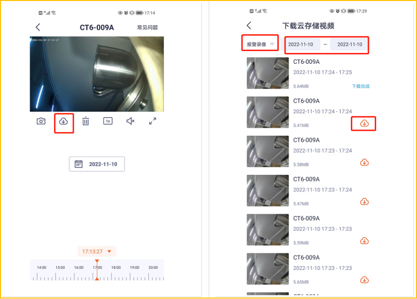 3.在云存储界面点击下载按键—选择需要下载的日期和时间—下载