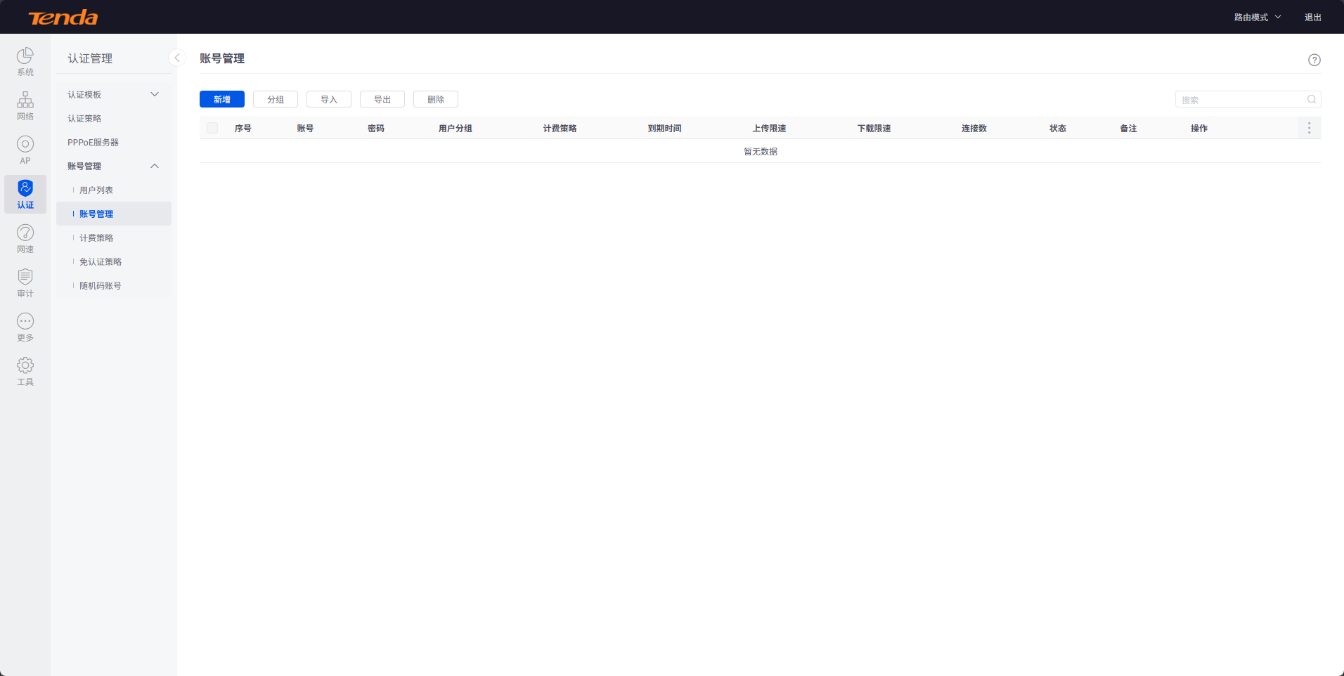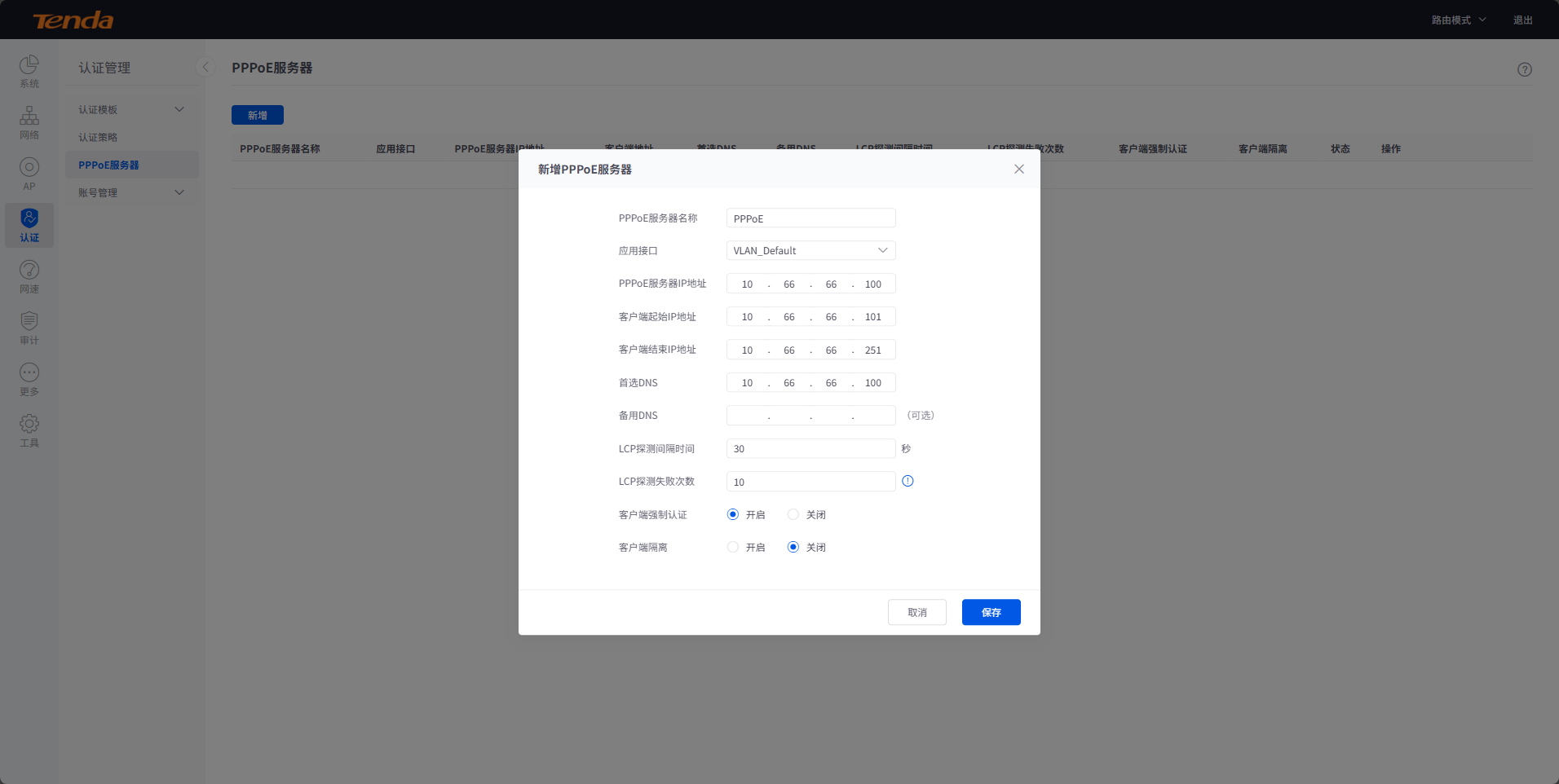点击“认证”-“PPPoE服务器”新增认证服务器