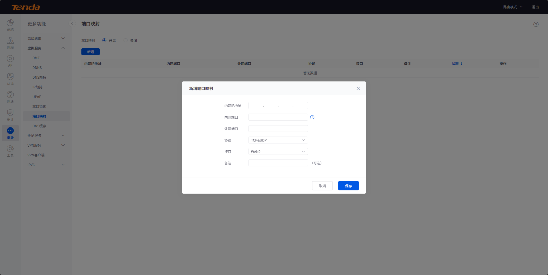 开启端口映射以后,点击“新增”添加IP与端口进行映射