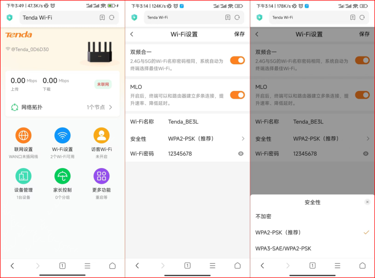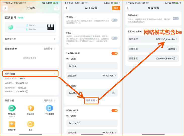 手机端使用Tenda WiFi APP查看方法:打开Tenda WiFi APP,点击路由器进入管理界面,点击“Wi-Fi设置”,分别点击2.4G Wi-Fi和5G Wi-Fi设置下的“高级设置”,查看网络模式需包含be模式。