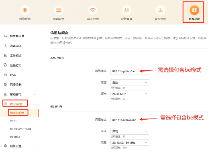 电脑端查看方法:登录路由器管理页面,打开“更多功能”—“WiFi设置”-“信道与频宽”,查看网络模式里应包含802.11be模式,路由器出厂默认包含be模式。