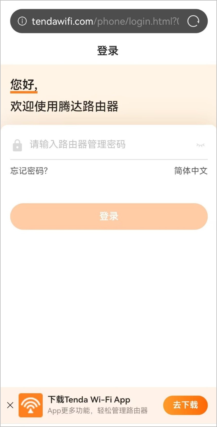 - 尝试使用路由器的默认地址(http://tendawifi.com或http://192.168.0.1)登录。