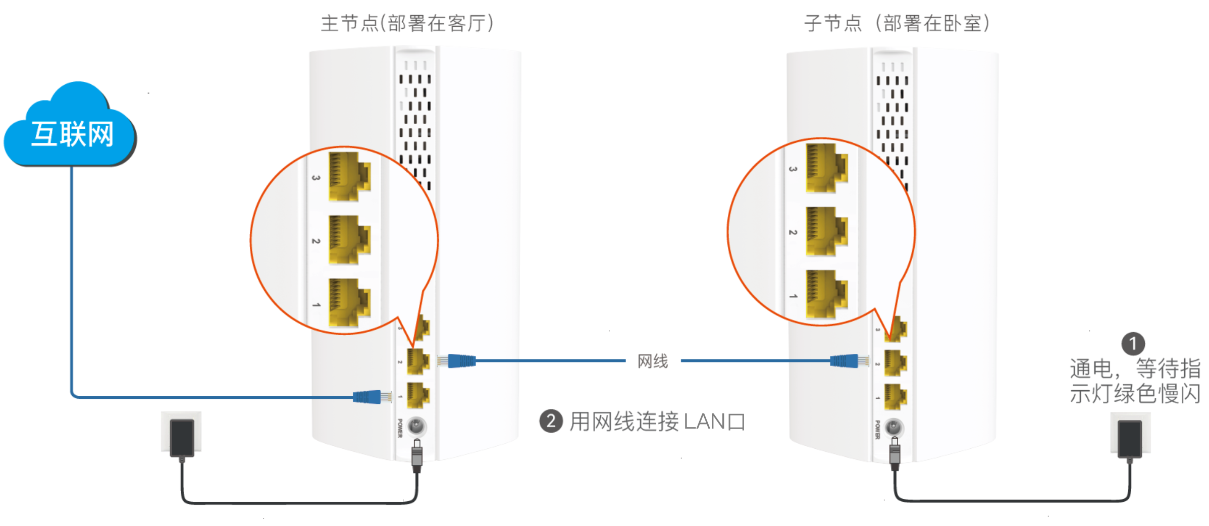 2. 参考以下说明将子节点放在需要部署Wi-Fi的位置并通电,等待指示灯绿色慢闪。