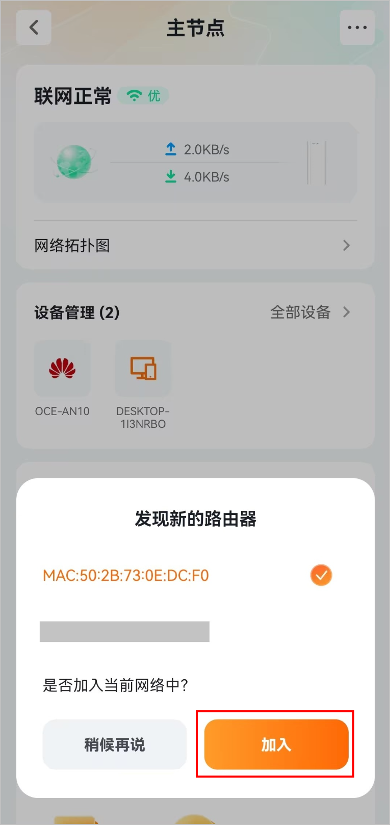 4. 待系统弹出发现新节点提示后,根据设备MAC地址找到新增路由器,点击连接。稍等片刻,添加成功。下图仅供参考。