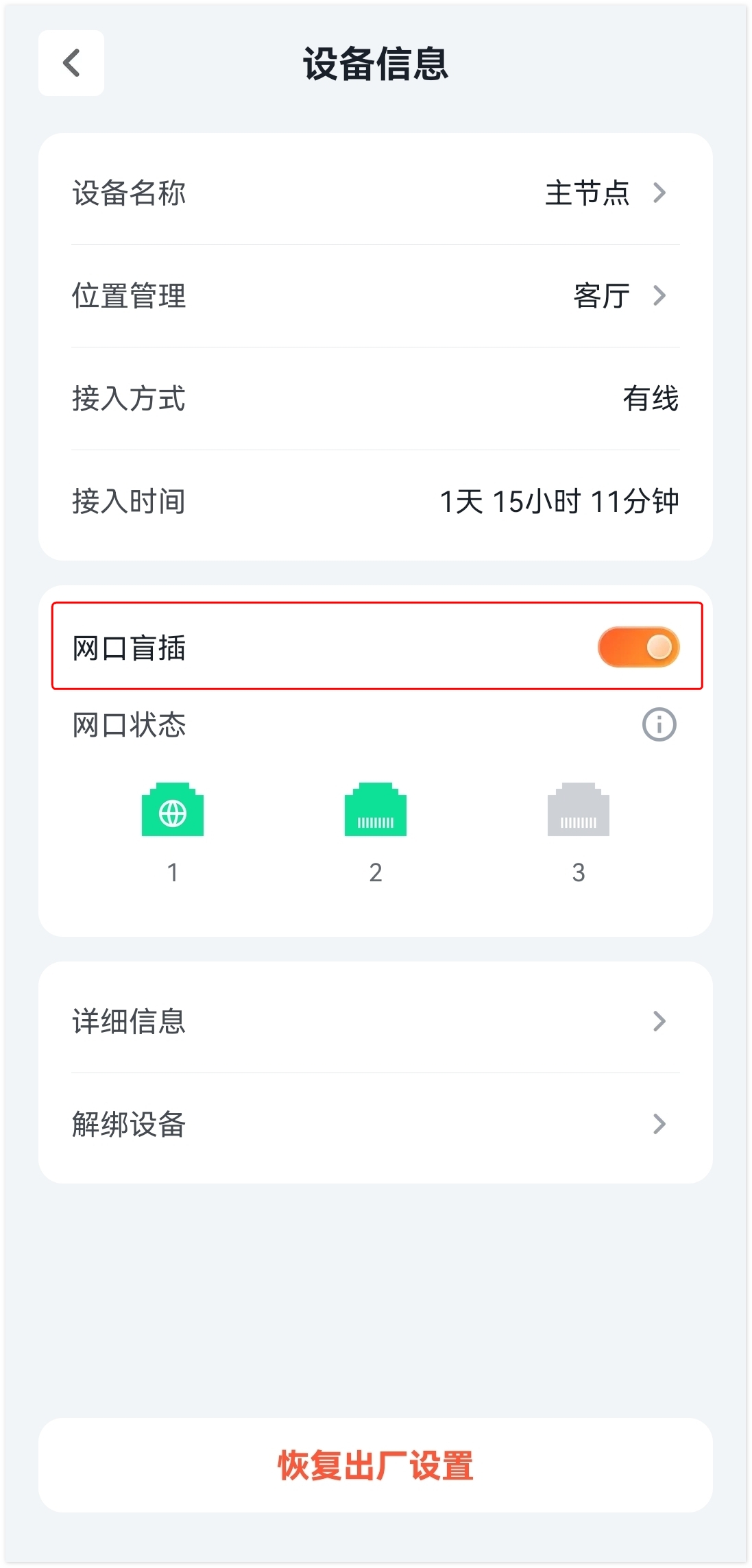 4. 根据实际情况开启或关闭网口盲插功能。