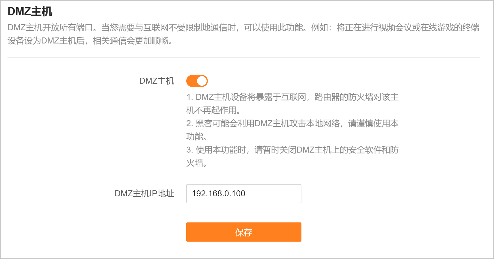 5. 输入DMZ主机IP地址,本例为192.168.0.100。
