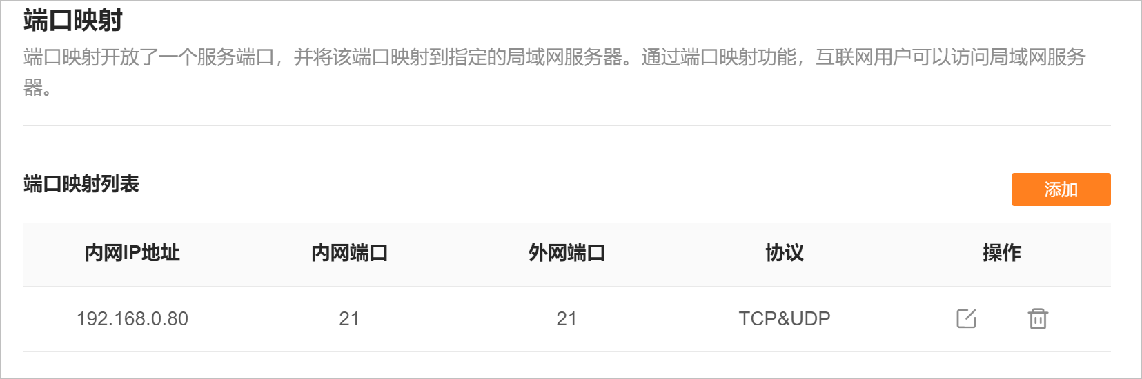 设置完成以后,互联网用户在浏览器地址栏输入“内网服务应用层协议名称://路由器WAN口IP地址”可以访问内网服务器。若您设置的外网端口与内网端口不同,访问格式为“内网服务应用层协议名称://路由器WAN口IP地址:外网端口”。