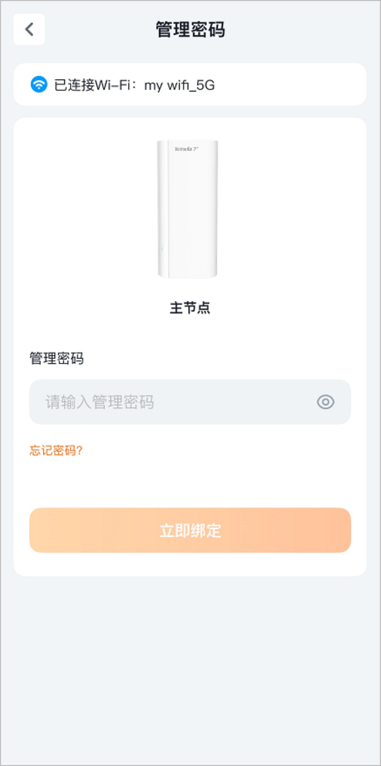 3. 输入路由器管理密码(如果需要),点击立即绑定。稍等片刻,绑定成功。下图仅供参考。