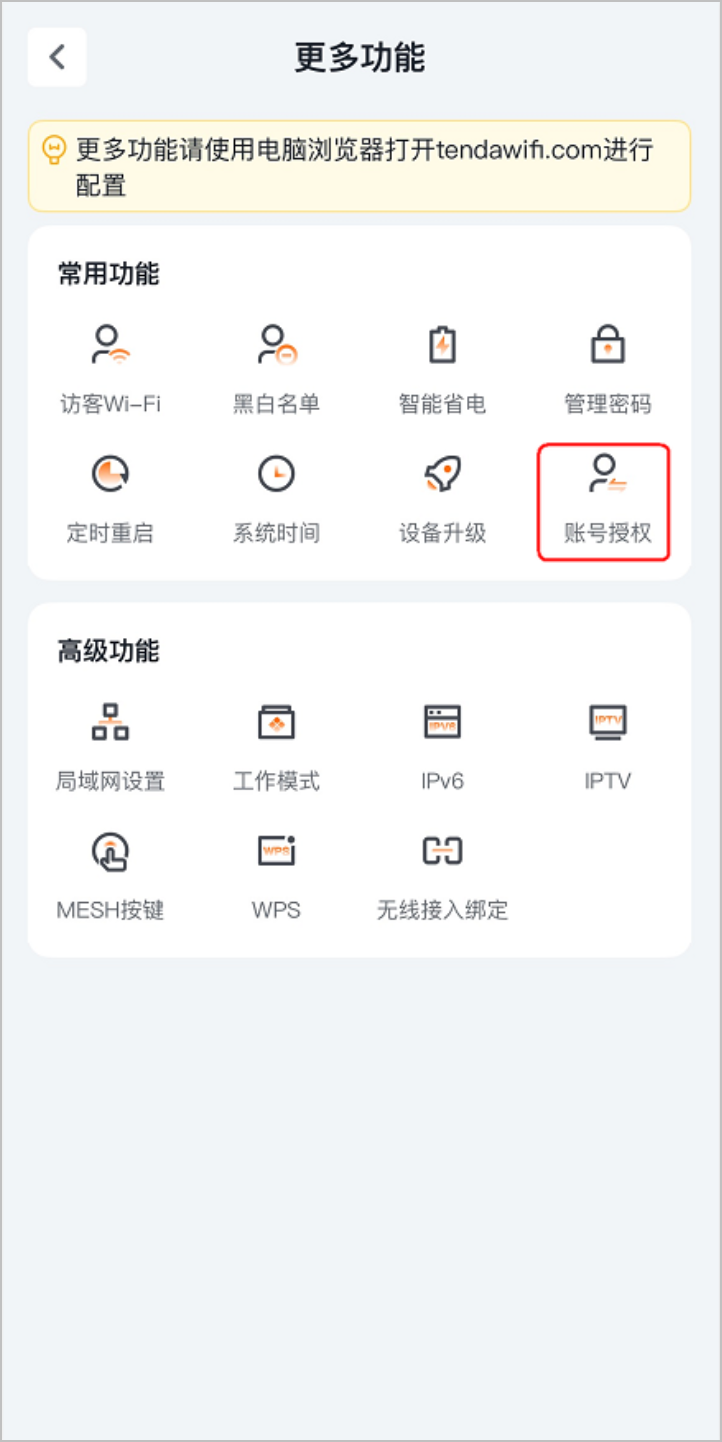 3. 点击更多功能>账号授权。下图仅供参考。
