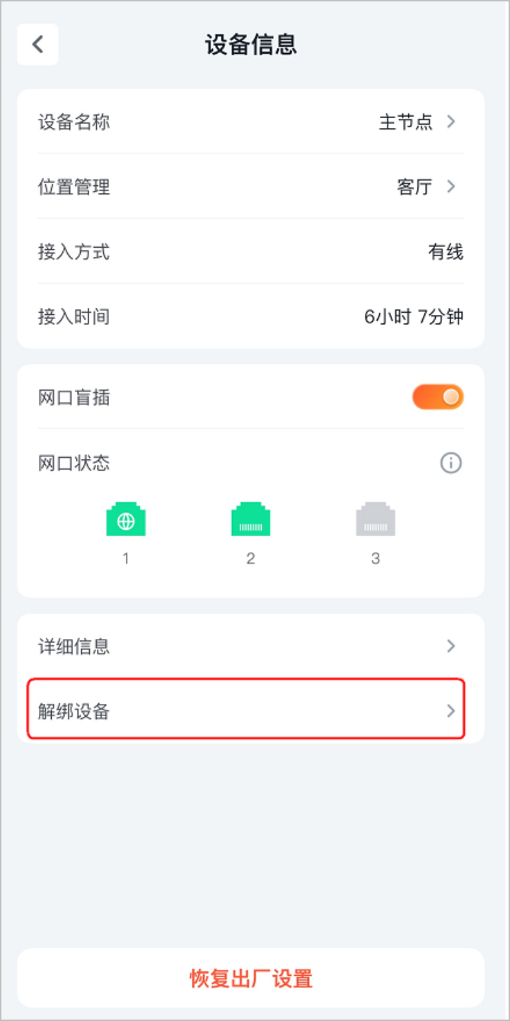 3. 点击右上角图标 ···,点击解绑设备。确认提示信息后,点击解绑。下图仅供参考。