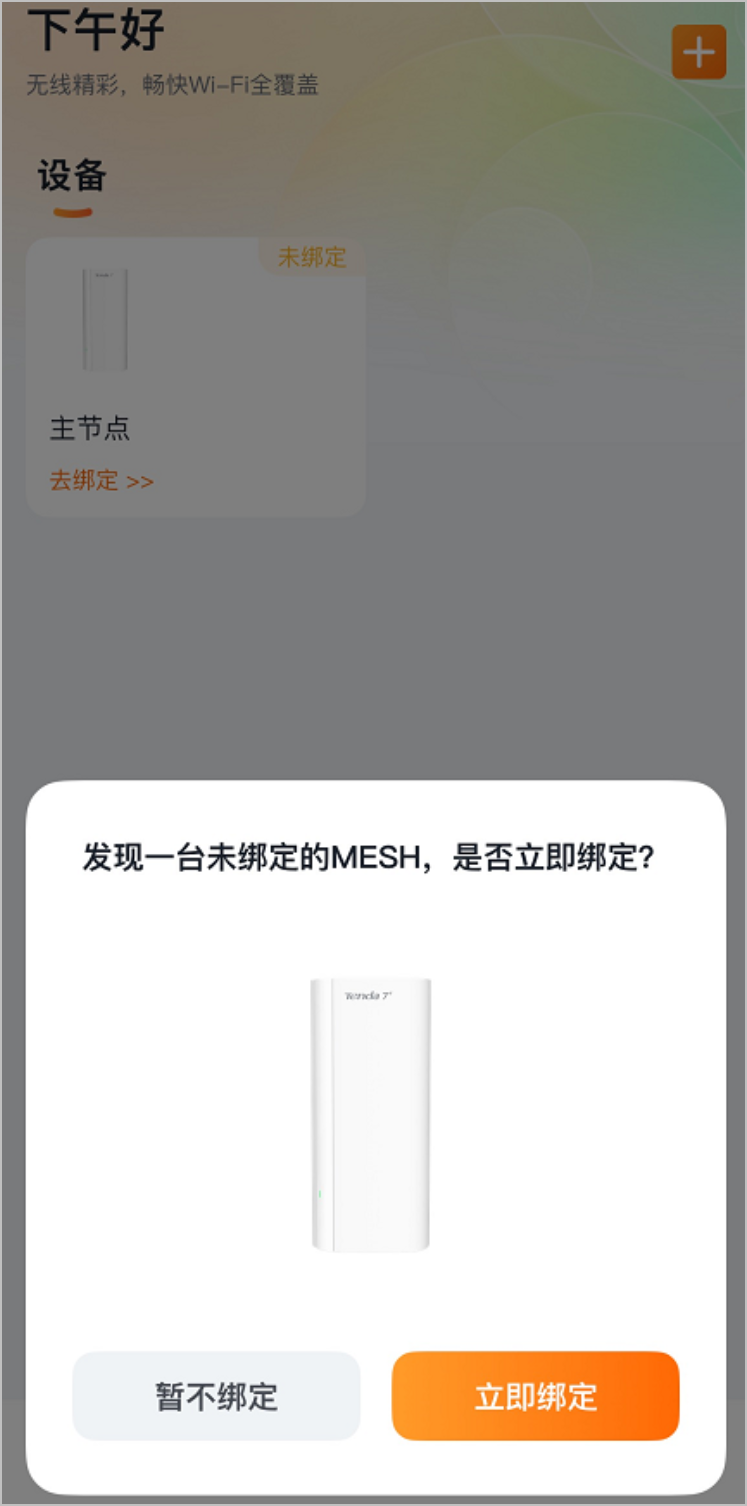 2. 打开Tenda WiFi App,待发现路由器后点击立即绑定或去绑定。下图仅供参考。