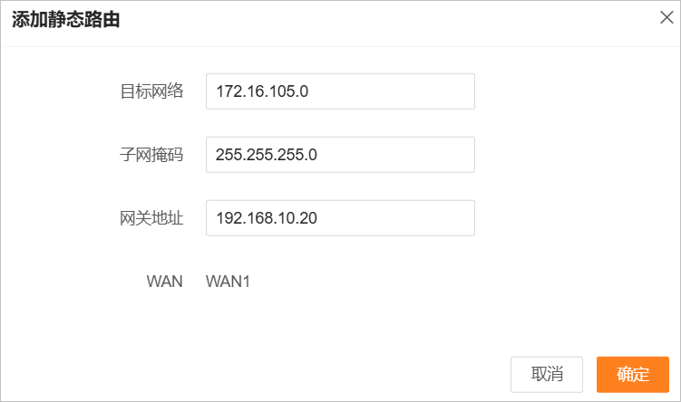 通过设置目标网络、子网掩码、默认网关和接口来确定一条静态路由,其中,目标网络和子网掩码用来确定一个目标网络或主机。静态路由设置完成后,所有目的地址为静态路由目标网络的数据均直接通过该静态路由接口转发至网关地址。