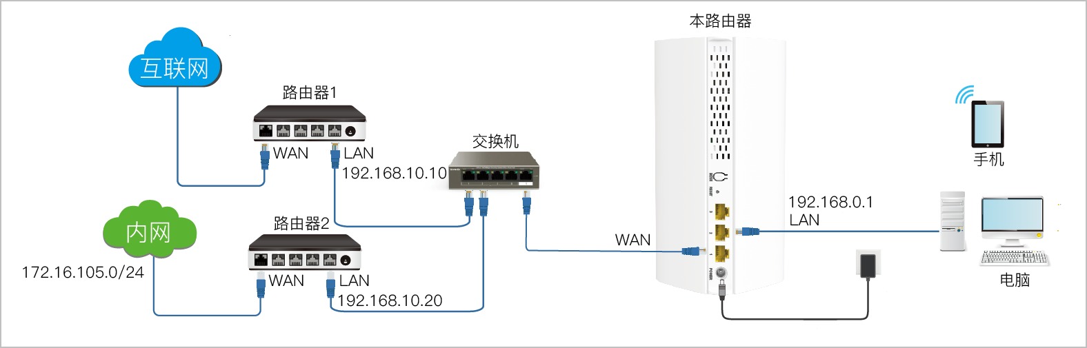 【场景】假设您使用本路由器和另外2台路由器搭建互联网和内网,路由器1已接入互联网,且开启了DHCP服务器;路由器2已接入内网,且关闭了DHCP服务器。路由器1和路由器2的LAN IP地址在同一网段。