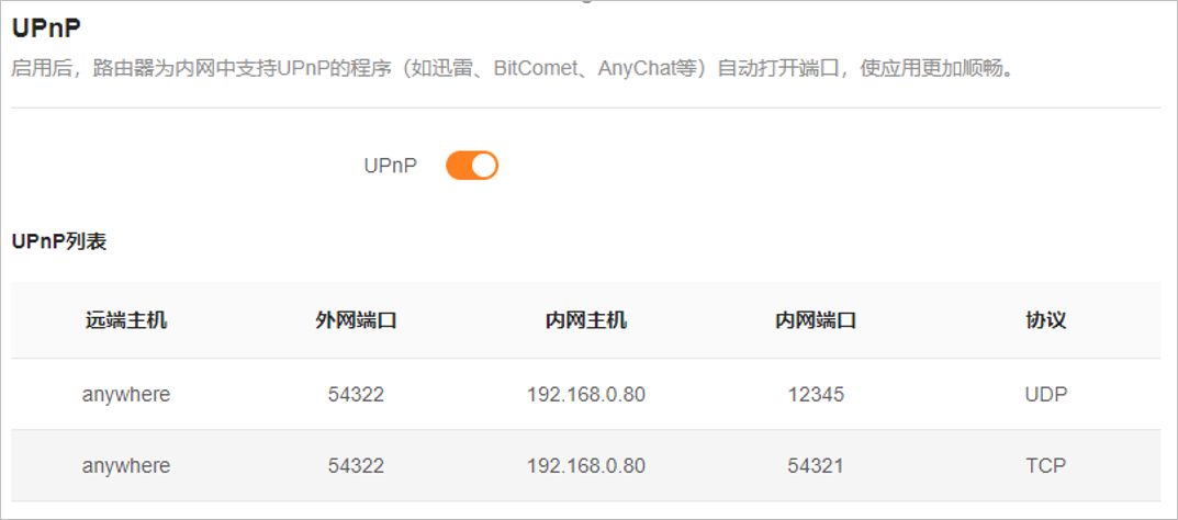 UPnP功能默认开启,当局域网中运行支持UPnP的程序(如迅雷等)时,可以在UPnP列表处看到端口转换信息。如下图示例。