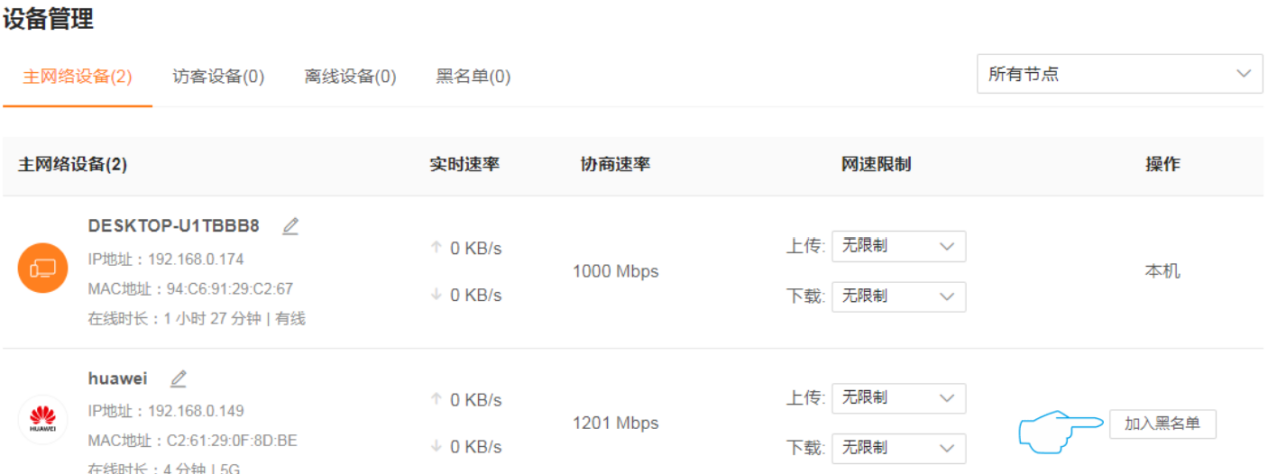 可以经常观察路由器管理界面的终端状态,通过查看已连接设备列表与实际所连接的设备情况是否一致,来判断是否被蹭网。若有可疑设备接入了自己的网络,可以在设备管理中点击加入黑名单不允许接入的设备。