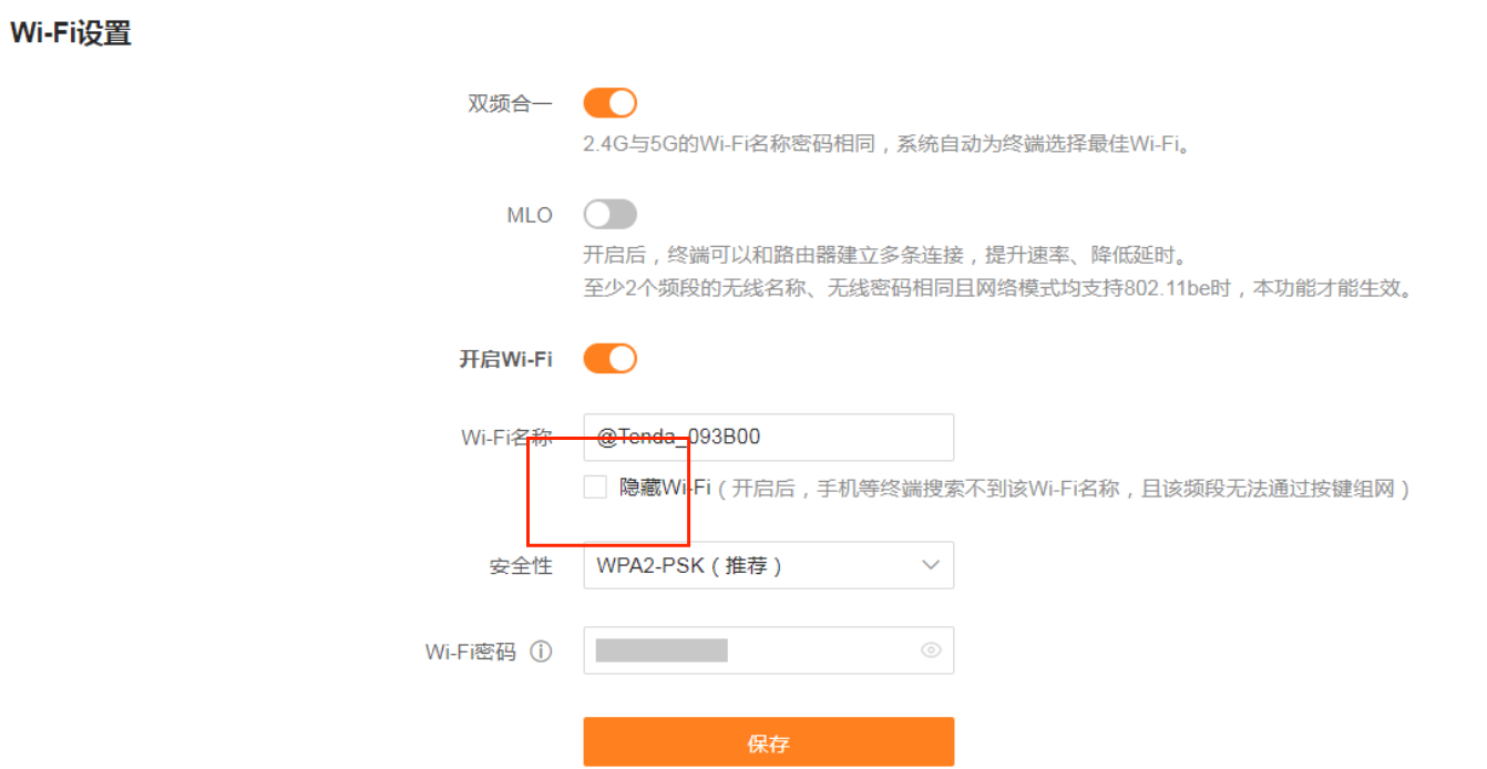 隐藏无线信号名称(SSID)即禁用无线广播,这样,在信号环境中无线设备搜索不到无线网络的信号。您可以通过在无线终端中手动添加信号名称和密码的方式连接无线网络。登录路由器管理界面,点击WIFI设置确认隐藏WIFI的框没有打勾。如下图:注意:禁用无线广播后,无线终端就无法正确搜索到该无线信号,需要在无线终端上手工添加无线配置文件来连接该无线信号。