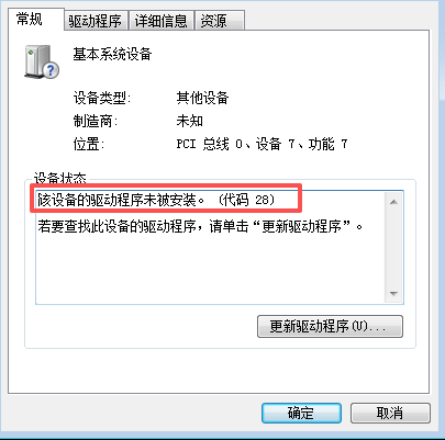 问题描述:电脑是windows7系统,安装网卡驱动后,网卡属性显示“28”代码,进入设备管理器,查看USB无线网卡打感叹号,如下图: