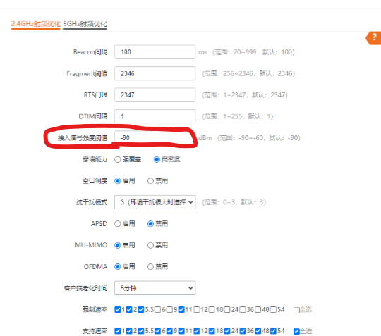 2、ap上漫游阈值配置过低,2.4G和5G漫游阈值默认都是-90dBm,可以适当调高漫游阈值,不过注意阈值不要调得太高,避免频繁触发漫游,一般 2.4G 漫游阈值可设置在-65 ~ -75dBm之间,5G 漫游阈值可设置在-70~-80dBm 之间。