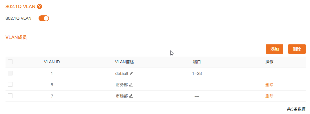 启用802.1Q VLAN功能后,您可以进入以下页面的“VLAN成员”模块查看、创建或者删除VLAN: