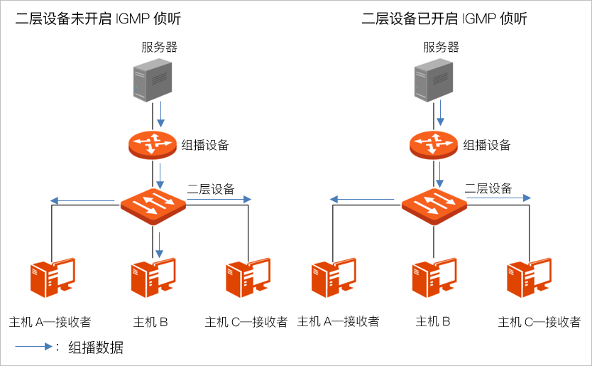 如下图所示,组播数据在没有运行IGMP侦听的二层设备中被广播;当二层设备运行了IGMP侦听后,设备通过对收到的IGMP报文进行分析,为端口和组播MAC地址建立起映射关系表,并根据这样的映射关系将组播数据转发给指定的接收者。