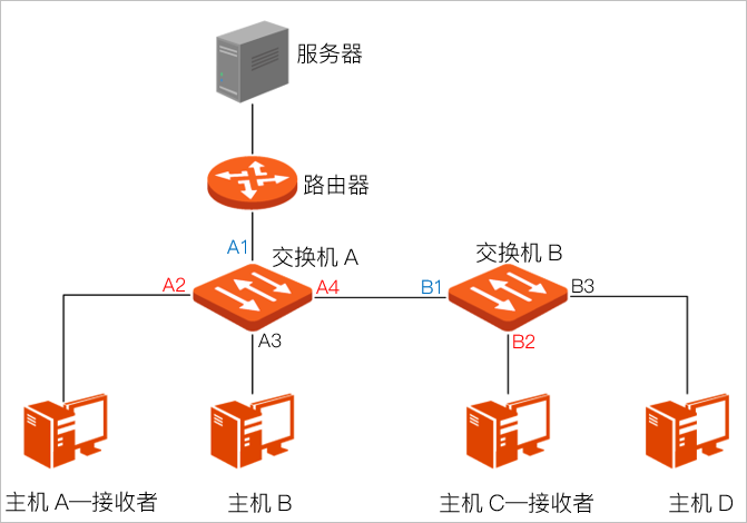 如下图,路由器连接组播源,交换机A和交换机B已开启IGMP侦听,主机A和主机C为组播数据的接收者。