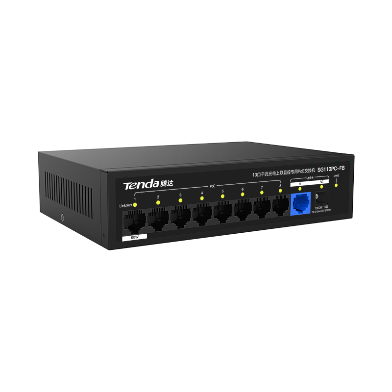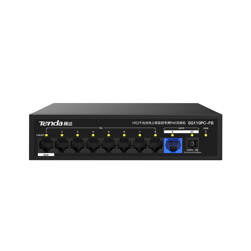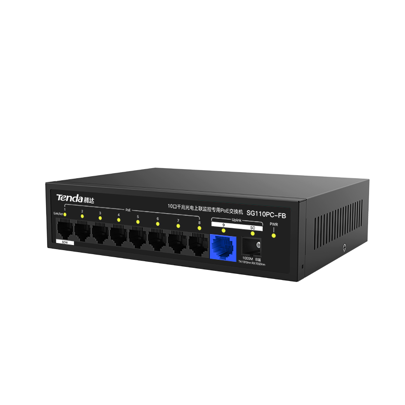 SG110PC-FB是腾达自主设计的一款千兆光电上联PoE交换机;内置SC光模块;支持看门狗,单口最大输出60W,整机功率120W,轻松带载400W摄像头,专为室外监控需求打造, 是小区、园区、城中村等监控组网的理想选择。